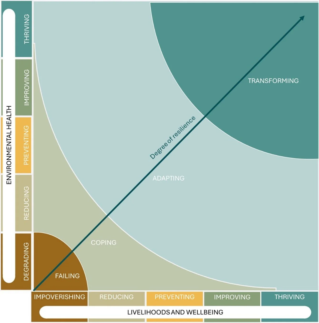 By combining environmental and livelihoods outcomes into a single matrix, it provides a decision-making tool for navigating complexity. It helps practitioners and policymakers identify what is happening and what is possible within a given context, assess pathways from coping to adaptation and transformation, and design NbS that prioritise people’s livelihoods while enabling nature to recover and thrive.